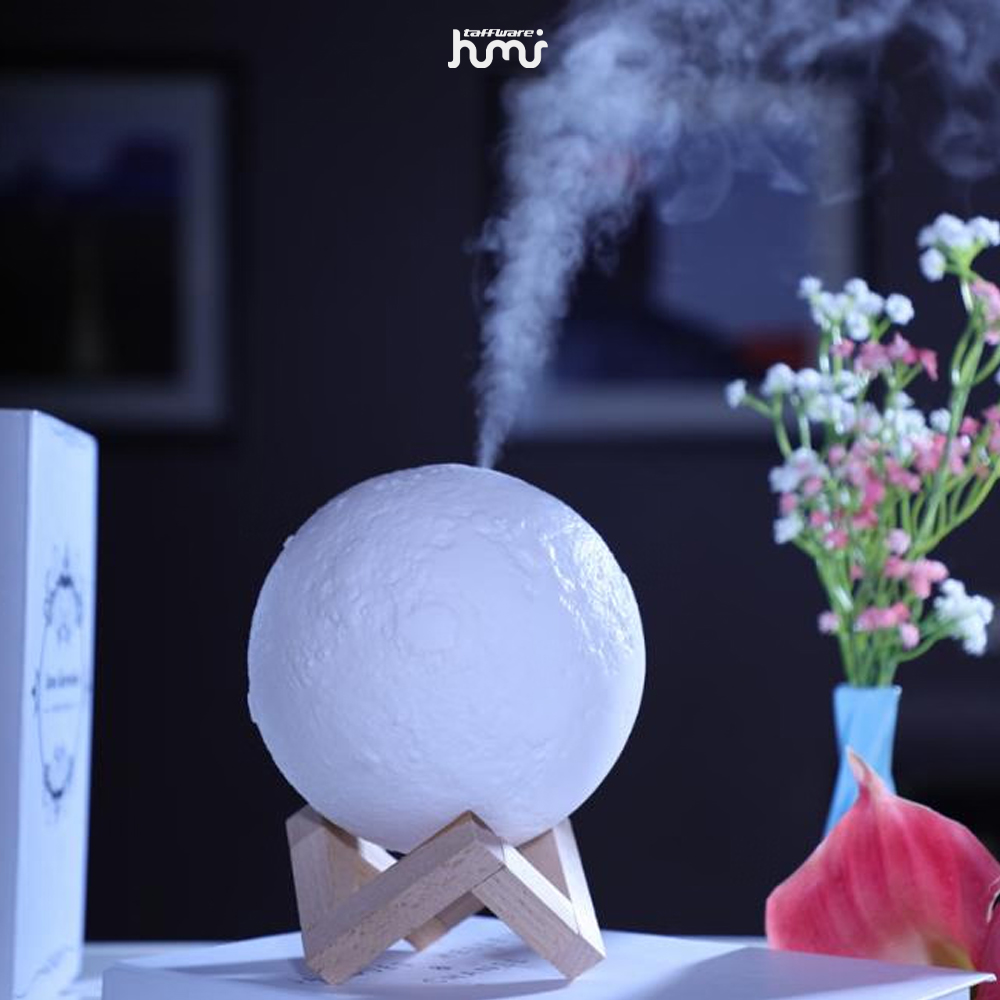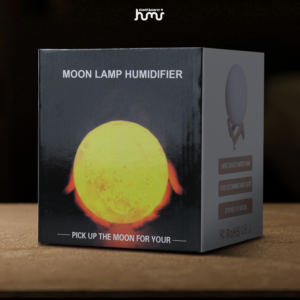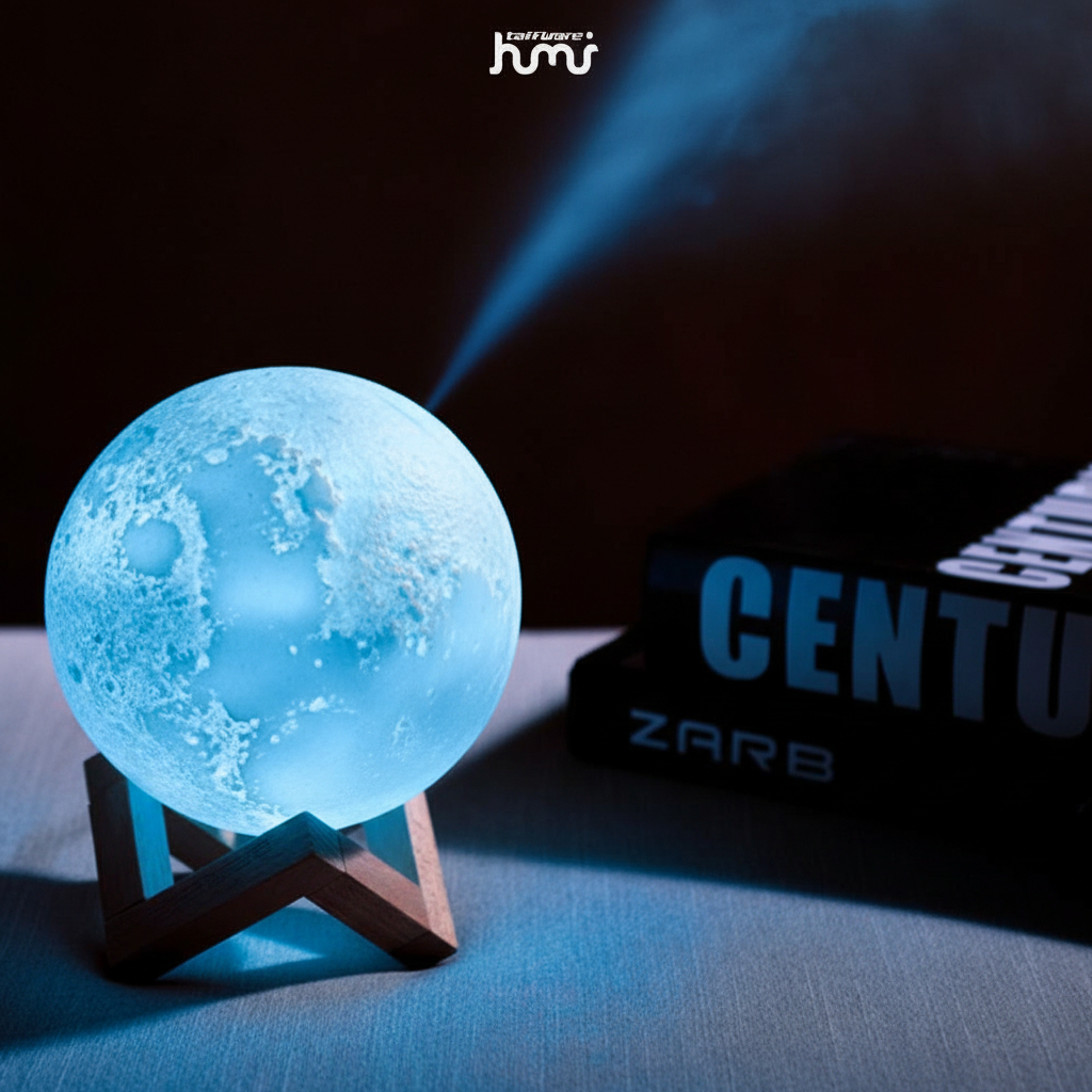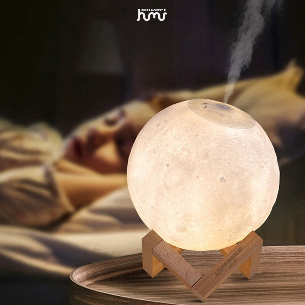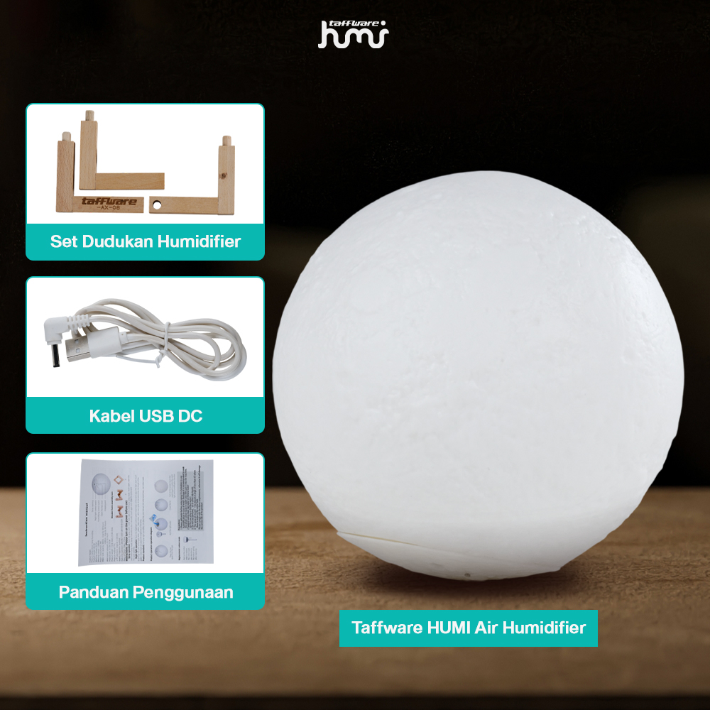 Humidifier Taffware HUMI hadir dengan tangki 880 ml, aliran 35 ml/jam untuk ruangan 10 M². Mesin no noise menjaga tidur tenang, sementara 7 warna cahaya lembut berganti otomatis dengan transisi halus. Desain bulan 3D realistis menjadikannya dekorasi unik sekaligus lampu tidur menenangkan.