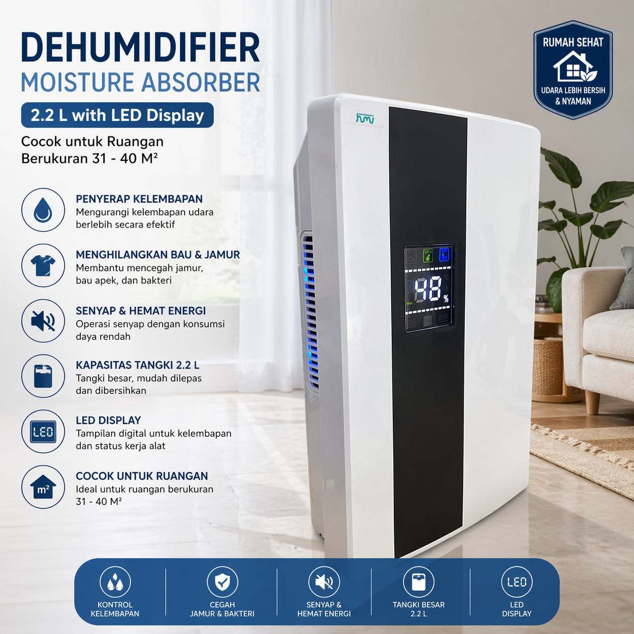 Apakah Anda merasa udara di rumah terasa lembap dan tak nyaman? Mungkin Anda sering mengalami masalah dengan jamur dan bau tak sedap di rumah? Jika iya, maka Anda membutuhkan dehumidifier dari Taffware HUMI. Dehumidifier akan menarik kandungan air di dalam udara untuk mengurangi kelembapan ruangan. Lengkap dengan tangki penampungan air berkapasitas 2.2 L dan selang untuk membuang air.