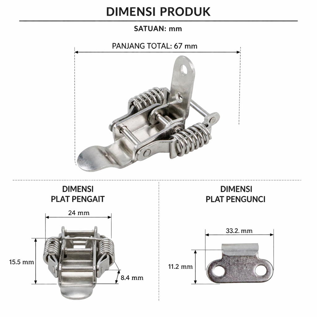 | Kuatnya Kuncian Pegas Kaitan peti ini mengadopsi komponen pegas. Sistem pegas memberikan tekanan kuat pada pengait sehingga barang di dalam peti atau kotak tetap aman dan tidak mudah terbuka. |
