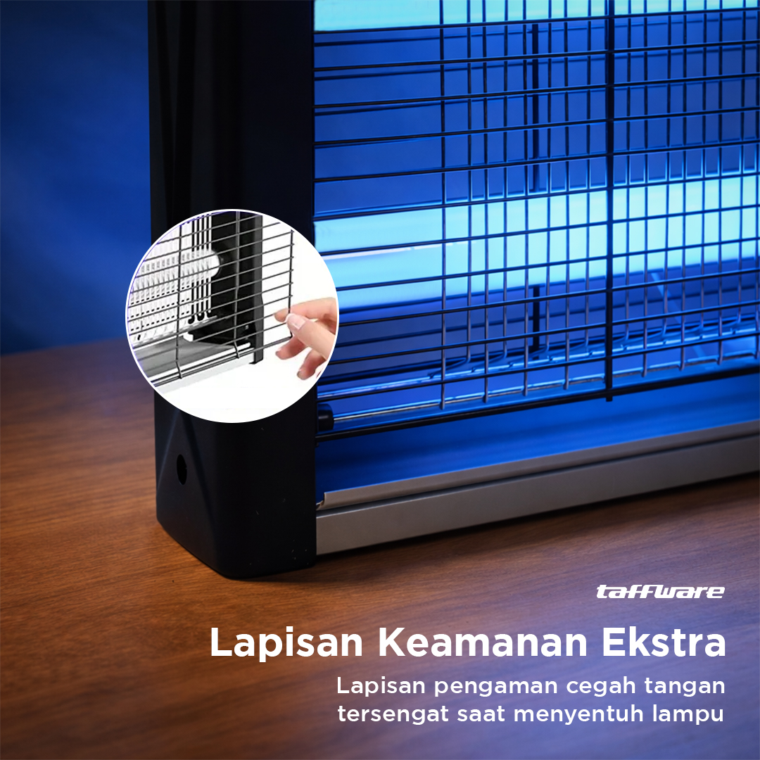| Lapisan Keamanan Ekstra Tak perlu khawatir tangan luka atau tersengat saat menyentuh lampu. Dilengkapi pagar pengaman, lampu anti nyamuk ini aman diletakkan di dalam ruangan. |