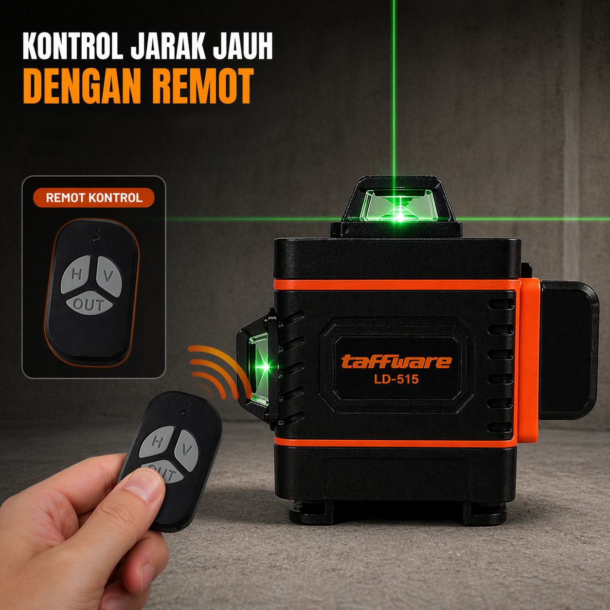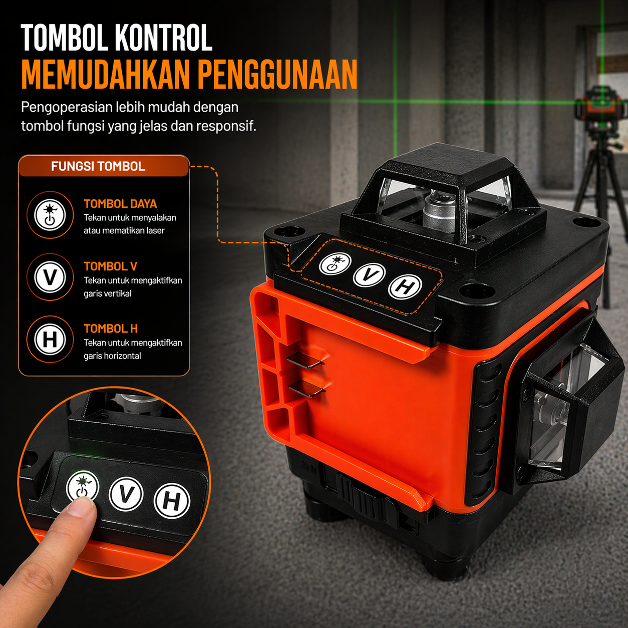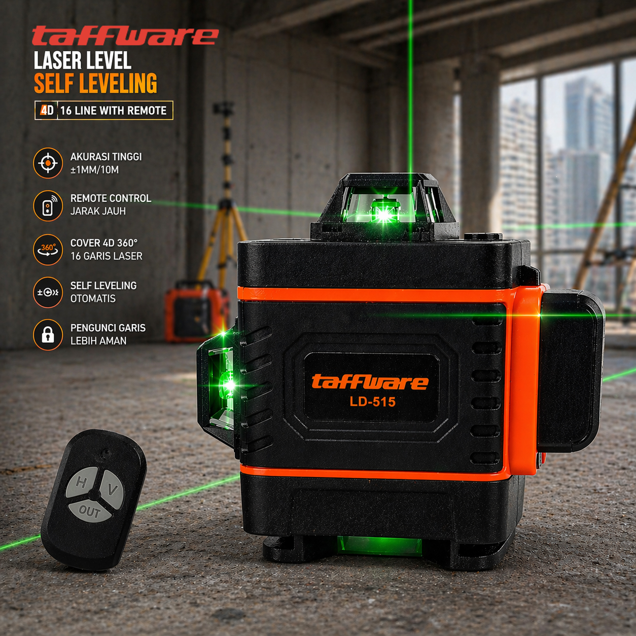 🔹 Dibekali 16 garis laser hijau dengan gelombang 532 nm yang terang, garis akan tetap mudah dilihat di bawah terik matahari.