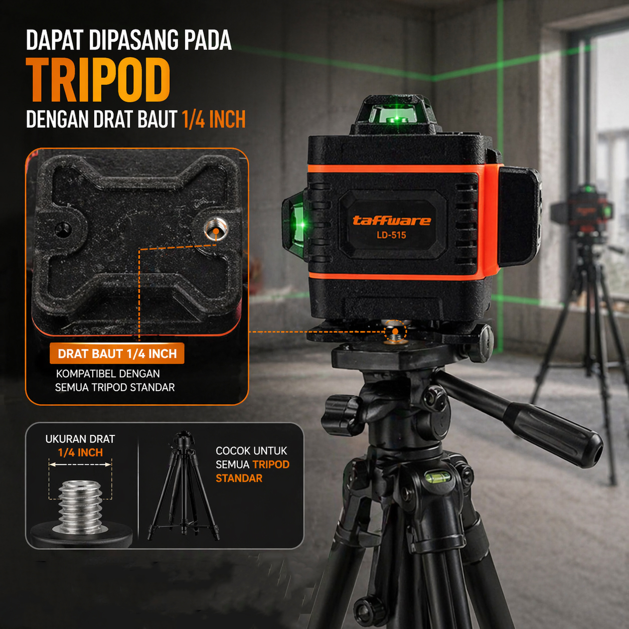 🔹 Bisa dipasang di tripod dengan drat baut 1/4 Inch untuk penempatan laser level yang lebih tinggi.