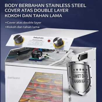 Mesin pengering makanan mampu mengurangi kadar air dengan menggunakan panas bersuhu rendah secara merata. Anda bisa menggunakannya untuk mengeringkan berbagai makanan agar menjadi lebih awet seperti buah, daging, sayur, dan lainnya. Terdiri dari 2 rear fan bertenaga, pengeringan 360°, rentang suhu 40-90 °C, rentang timer hingga 12 jam, dan wadah stainless steel food grade yang aman untuk makanan. Hadir dengan 18 layer sehingga bisa mengeringkan banyak makanan sekaligus.