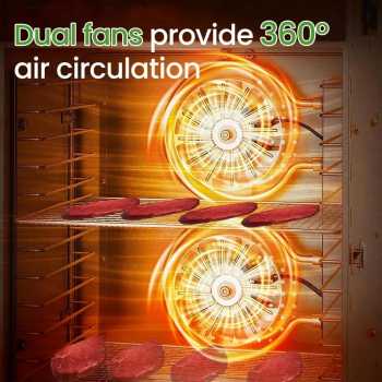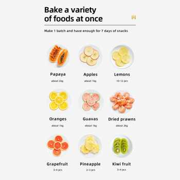 | Penyesuaian Suhu 30–90 °C Mesin bekerja pada rentang suhu 30–90 °C, memungkinkan penyesuaian panas sesuai karakteristik bahan makanan. Anda bisa mengeringkan tumbuhan herbal dalam suhu 35-45 °C, roti 40-50 °C, sayuran 50-55 °C, buah 55-60 °C, dan daging/ikan suhu 65-68 °C. Satuan suhunya juga bisa Anda ubah dengan mudah antara °C atau °F. |