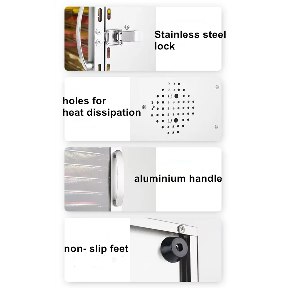 | Konstruksi Stainless Steel Kokoh Bodi mesin pengering makanan terbuat dari material stainless steel yang kuat, tahan karat, tahan panas, dan mudah dibersihkan. Bagian bawahnya dilengkapi dengan kaki karet anti slip yang stabil di berbagai permukaan. |