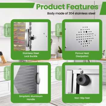 | Konstruksi Stainless Steel Kokoh Bodi mesin pengering makanan terbuat dari material stainless steel yang kuat, tahan karat, tahan panas, dan mudah dibersihkan. Bagian bawahnya dilengkapi dengan kaki karet anti slip yang stabil di berbagai permukaan. |