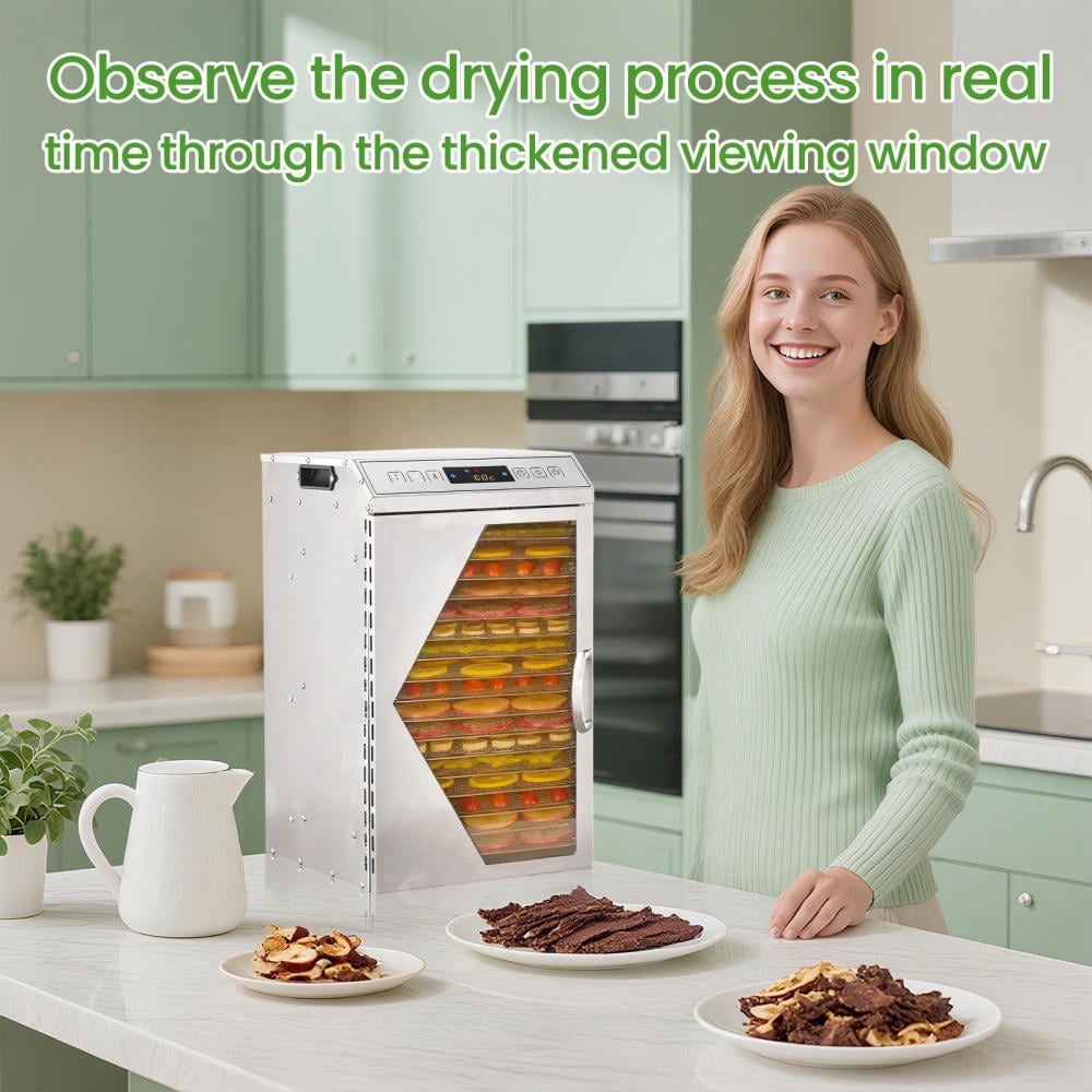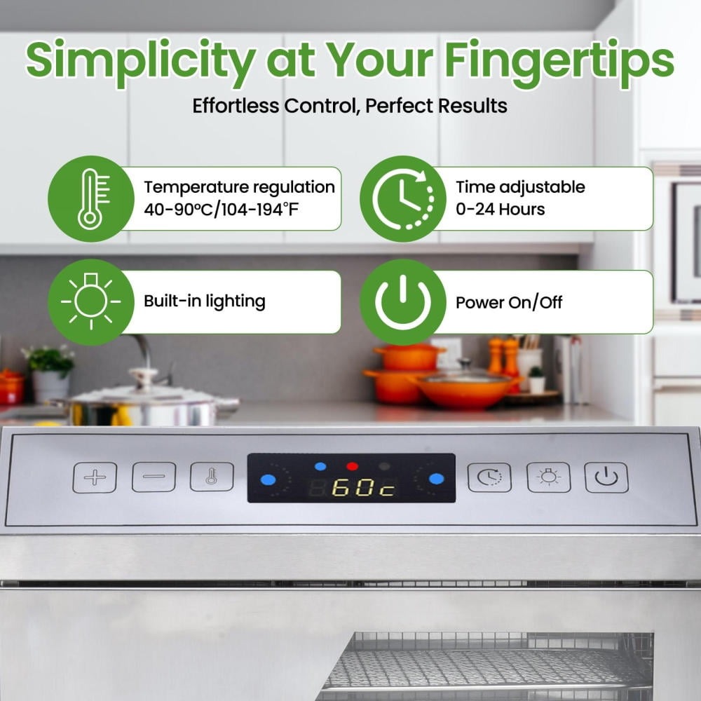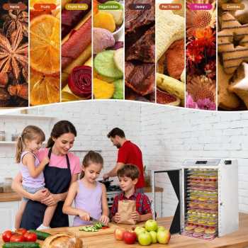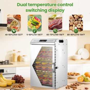 | Penyesuaian Suhu 30–90 °C Mesin bekerja pada rentang suhu 30–90 °C, memungkinkan penyesuaian panas sesuai karakteristik bahan makanan. Anda bisa mengeringkan tumbuhan herbal dalam suhu 35-45 °C, roti 40-50 °C, sayuran 50-55 °C, buah 55-60 °C, dan daging/ikan suhu 65-68 °C. Satuan suhunya juga bisa Anda ubah dengan mudah antara °C atau °F. |