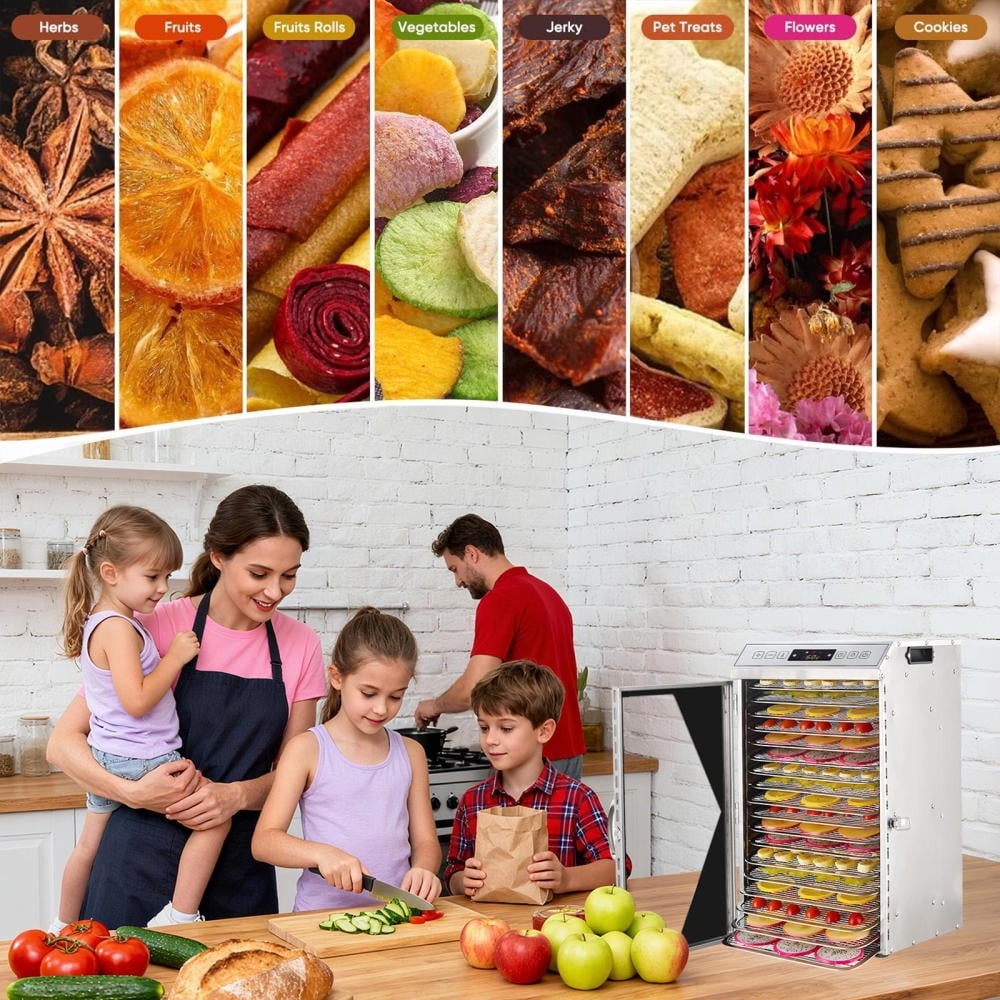 Mesin pengering makanan mampu mengurangi kadar air dengan menggunakan panas bersuhu rendah secara merata. Anda bisa menggunakannya untuk mengeringkan berbagai makanan agar menjadi lebih awet seperti buah, daging, sayur, dan lainnya. Terdiri dari rear fan bertenaga, pengeringan 360°, rentang suhu 30-90 °C, rentang timer hingga 24 jam, dan wadah stainless steel food grade yang aman untuk makanan. Hadir dengan pilihan varian 12 layer atau 18 layer yang bisa Anda pilih sesuai dengan kebutuhan.