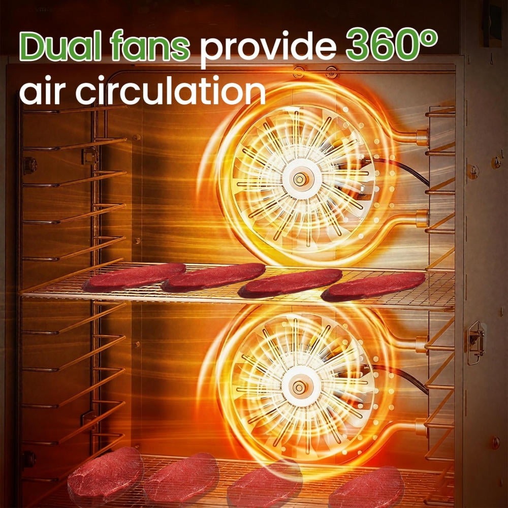 | Sistem Sirkulasi Panas 360° Menggunakan 360° circulating heating system dan 2 rear fan, mesin ini mendistribusikan udara panas secara menyeluruh ke setiap tray. Tidak ada area lembap atau kering sebagian, sehingga seluruh bahan makanan matang dan kering secara konsisten, menghasilkan kualitas pengeringan yang seragam di setiap rak. |