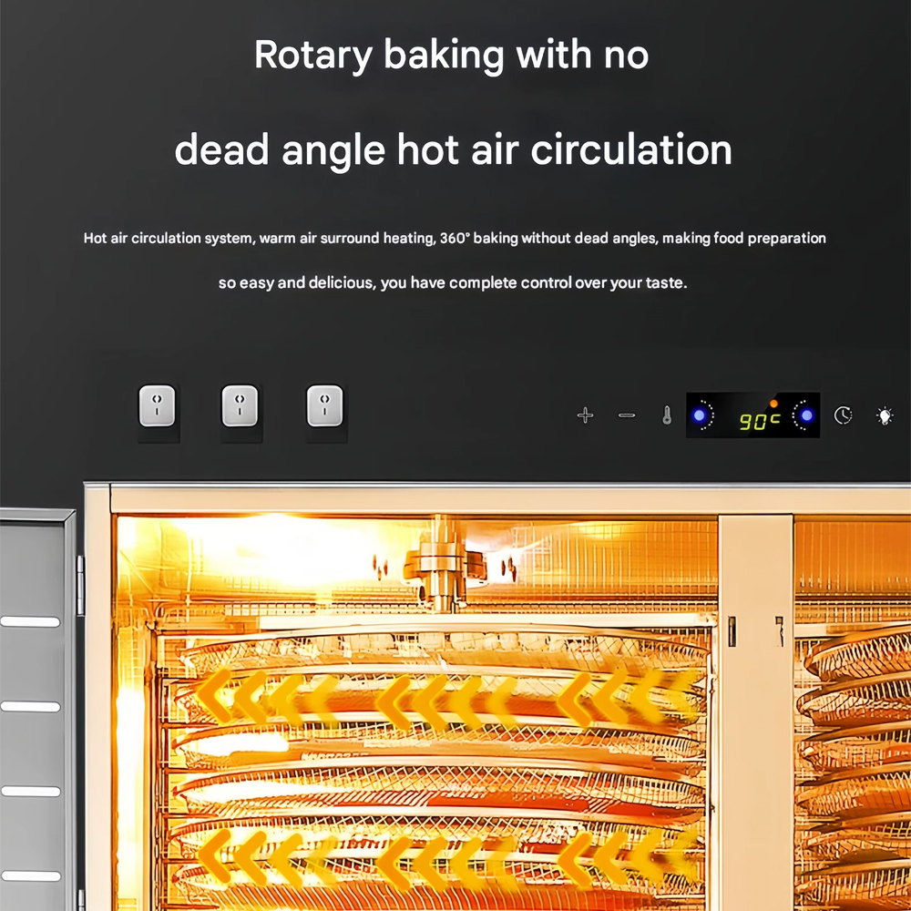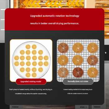 | Pengeringan Berputar 360° Keunggulan utama pengering makanan ini terletak pada rotating food tray system, di mana seluruh rak berputar otomatis 360° selama proses pengeringan. Sistem ini memastikan setiap sisi makanan mendapatkan paparan panas yang sama, menghilangkan area lembap dan mencegah pengeringan tidak merata. Hasilnya, buah, sayuran, daging, dan herbal kering secara konsisten dari lapisan atas hingga bawah. |