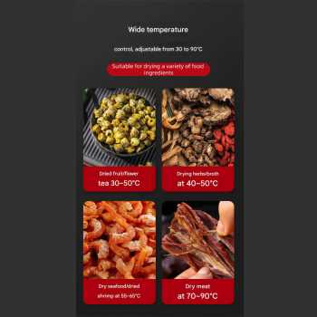 Mesin pengering makanan mampu mengurangi kadar air dengan menggunakan panas bersuhu rendah secara merata. Anda bisa menggunakannya untuk mengeringkan berbagai makanan agar menjadi lebih awet seperti buah, daging, sayur, dan lainnya. Terdiri dari kipas belakang besar, pengeringan berputar 360°, rentang suhu 40-90 °C, rentang timer 0-24 jam, hingga wadah stainless steel food grade yang aman untuk makanan.