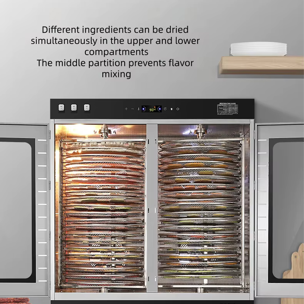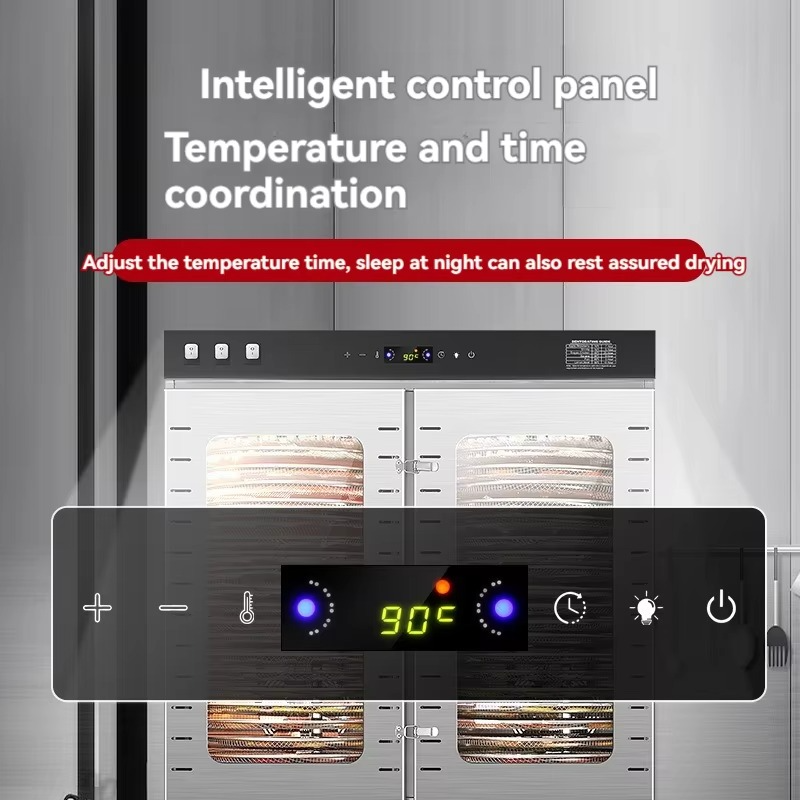 | Timer hingga 24 Jam Mesin pengering makanan ini dilengkapi sistem timer digital presisi dengan rentang waktu 0–24 jam. Fitur timer ini memungkinkan metode “set and forget operation”, di mana mesin dapat beroperasi secara mandiri tanpa pengawasan terus-menerus. Setelah waktu pengeringan berakhir, sistem akan berhenti secara otomatis sehingga mencegah over-drying |