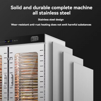 | Bodi Stainless Steel Kokoh Bodi mesin pengering makanan terbuat dari material stainless steel 201 yang kuat, tahan karat, tahan panas, dan mudah dibersihkan. Bagian bawahnya dilengkapi dengan kaki karet anti slip yang stabil di berbagai permukaan. |