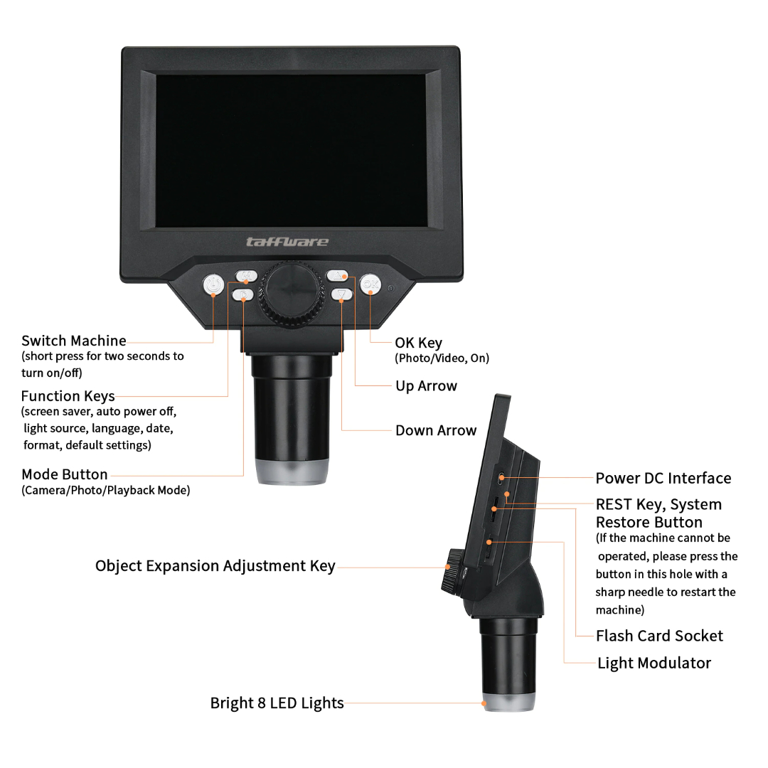 | Kamera 10 MP dengan Monitor HD Pembesaran pada mikroskop digital ini menggunakan lensa kamera 10 MP dengan sensor tipe CCD sehingga mampu menghasilkan gambar video yang cukup jelas. Anda juga bisa melihatnya secara real time pada monitor 5.5 Inch yang sudah menyatu dengan mikroskop. Anda dapat menggunakan mikroskop ini untuk keperluan inspeksi industrial, belajar mengajar, observasi mikrobiologi, penyelidikan kulit dan rambut, dan bantuan penglihatan lainnya. |