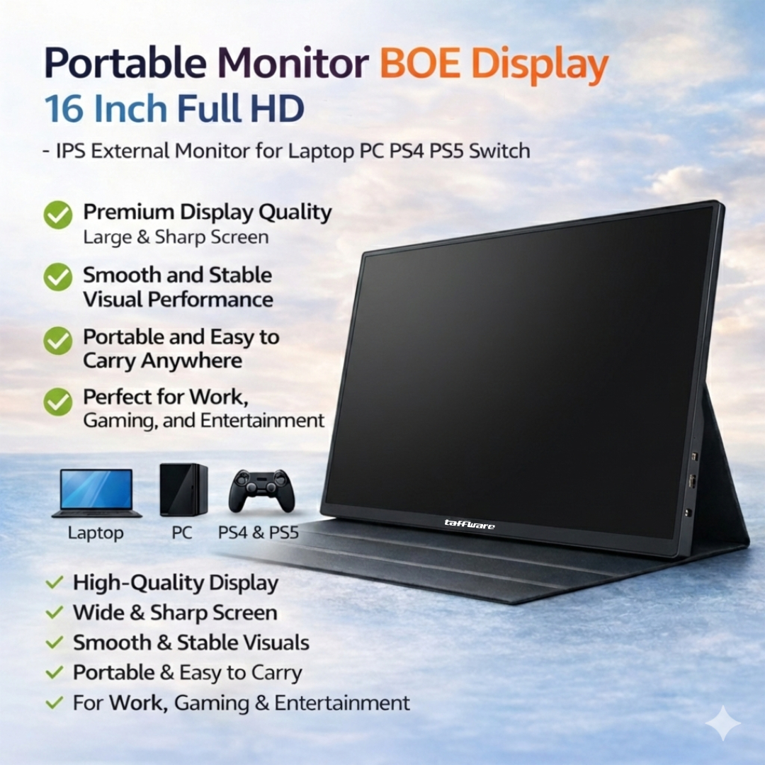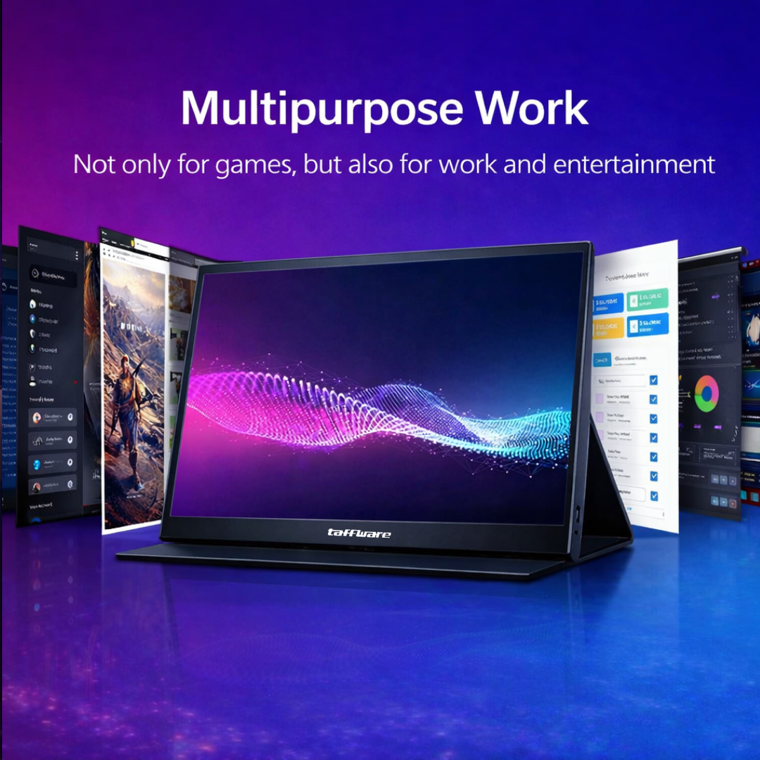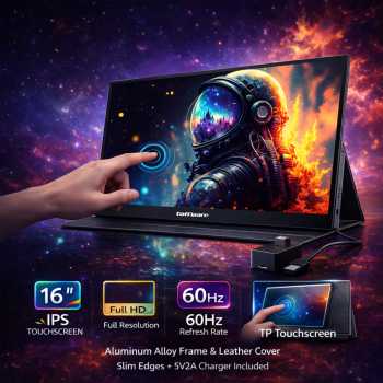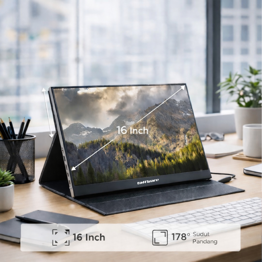 Tingkatkan produktivitas saat bekerja menggunakan portable monitor Taffware. Layar IPS Touchscreen berukuran 16 Inch menampilkan resolusi Full HD 1920 x 1200 pixels dengan refresh rate 60 Hz, menghasilkan tampilan jernih, halus dan nyaman di mata. Dilengkapi touchscreen, desain bazer tipis (Slim Edges) memberikan kesan modern dan memperluas area pandang. Dilengkapi bingkai alumunium alloy dan cover kulit yang kuat dan elegan.