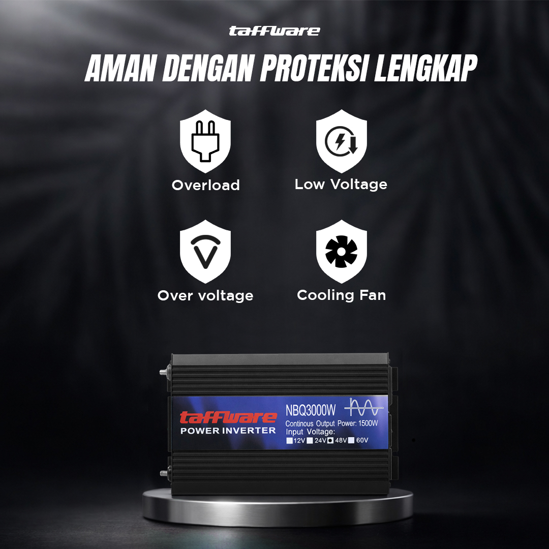 Kesulitan mengakses sumber listrik selama perjalanan atau camping? Power inverter mobil Taffware solusinya! Bekerja denganmengubah arus DC dari aki menjadi arus AC yang siap pakai, kini Anda dapat menggunakan berbagai alat elektronik. Gelombang pure sine wave yang stabil dengan output puncak 3000 W, dapat mengisi daya laptop, smartphone, lampu, dan perangkat lainnya. Dilengkapi proteksi untuk mengurangi risiko kerusakan pada aki dan perangkat Anda.