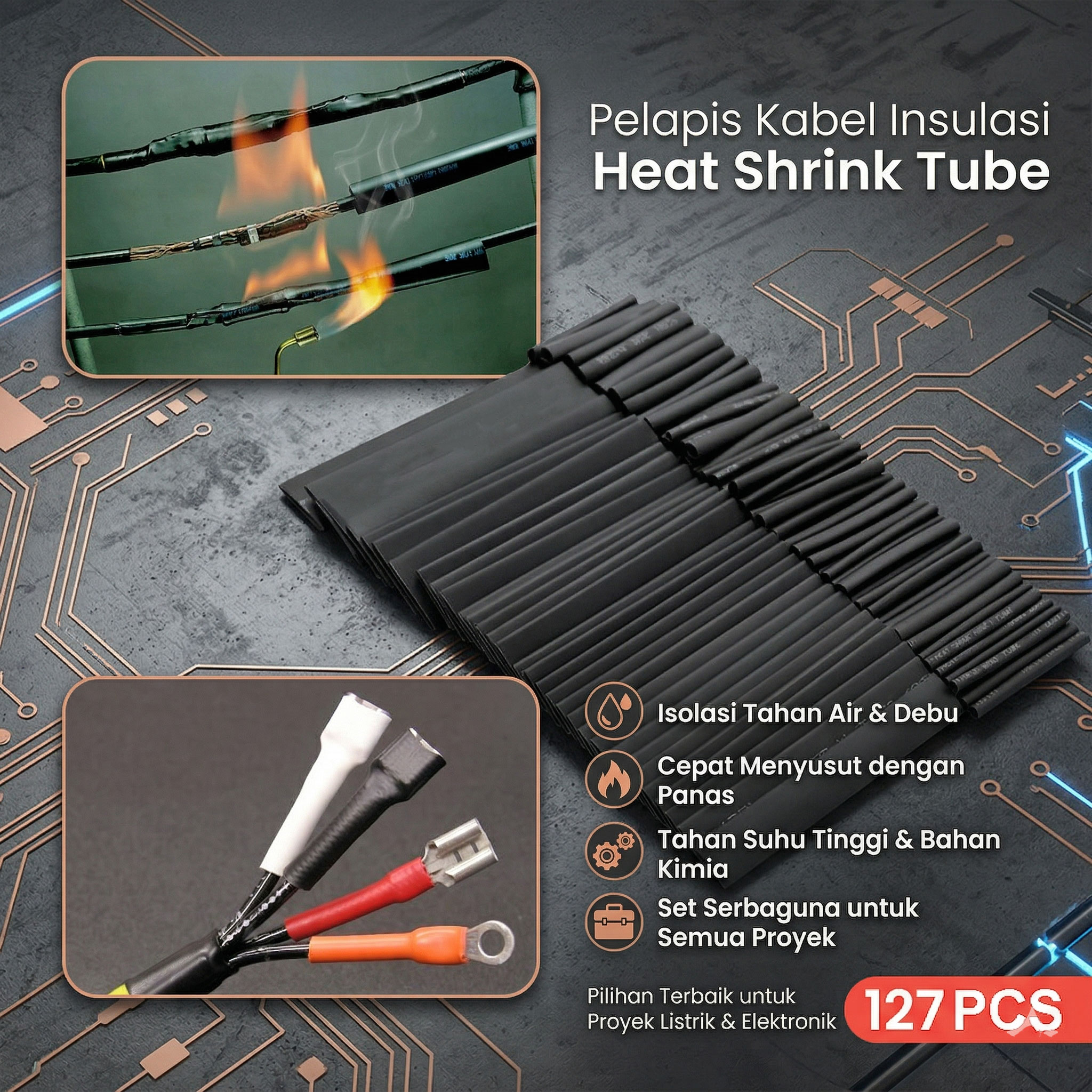 🔹 7 Jenis selongsong mampu mengakomodasi berbagai ukuran kabel elektronik hingga otomotif.