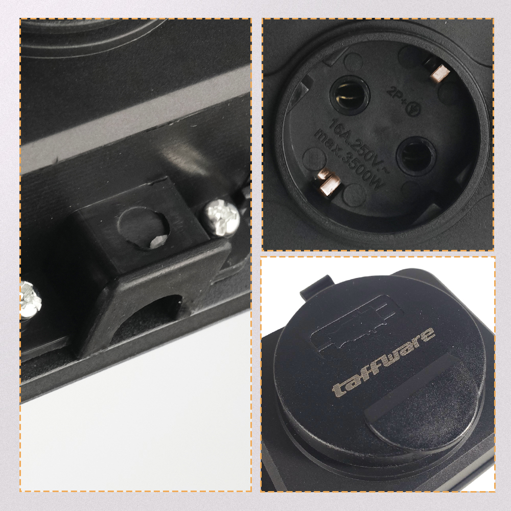 Butuh soket listrik yang andal dan anti air? Inilah saatnya menggunakan stop kontak terminal dari Taffware. Dengan arus 16 A dan tegangan 250 V, stop kontak ini siap menyalurkan daya ke berbagai perangkat elektronik. Alat ini juga tahan air sehingga cocok dipasang di luar ruangan. Anda bahkan bisa menutup setiap soket jika tidak digunakan agar lebih aman karena telah dibekali penutup.