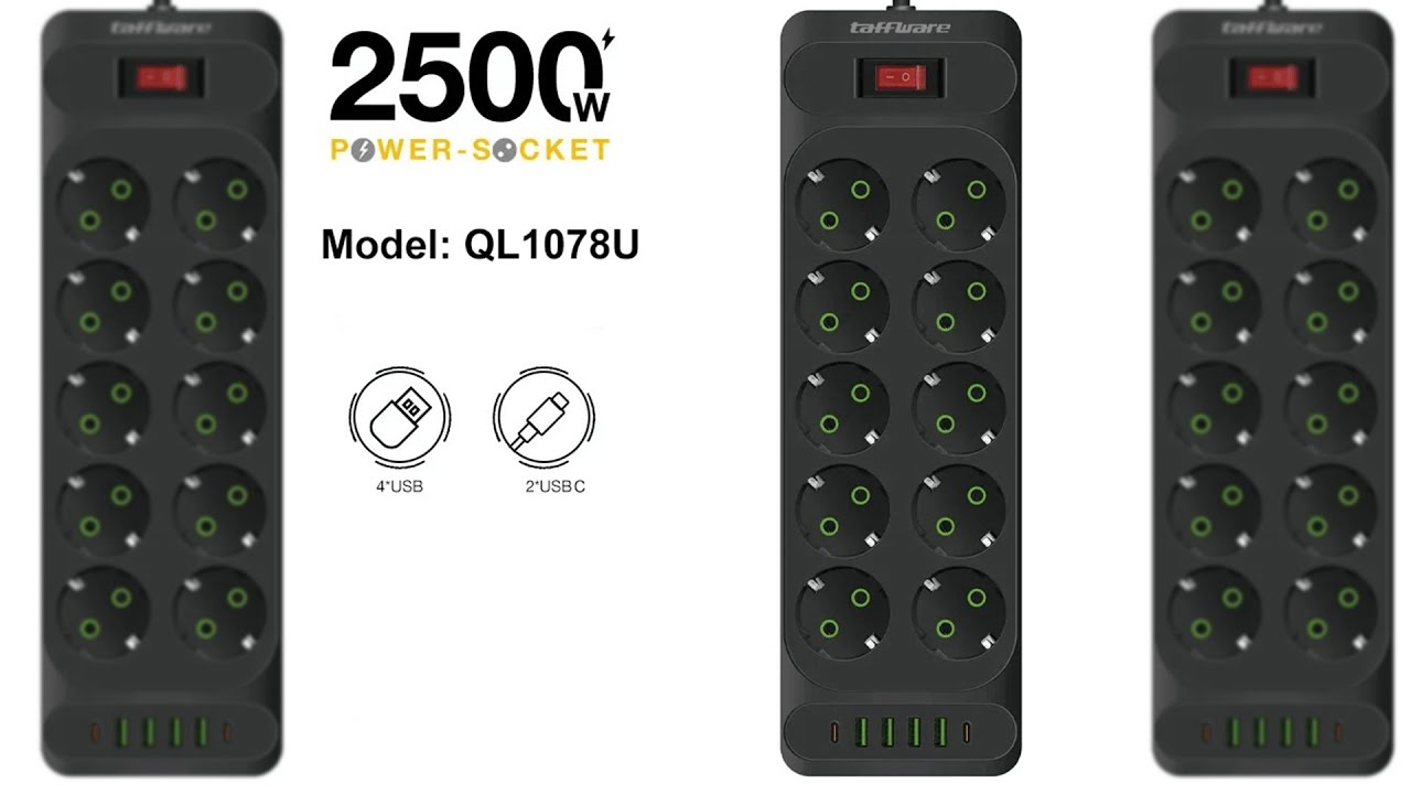 Menyalakan banyak perangkat elektronik sekaligus semakin praktis dengan stop kontak Taffware. Menawarkan 8 dan 10 soket EU atau universal dan port USB dengan total output 2500 W cocok untuk berbagai kebutuhan. Semakin aman dengan tombol saklar untuk memutus arus listrik tanpa harus mencabut kabel.