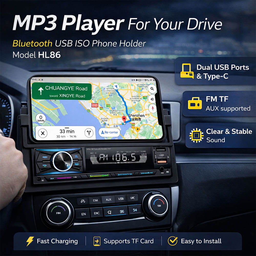 Taffware tape mobil HL86, head unit single DIN dengan hands-free, streaming musik, dan holder HP praktis untuk navigasi lebih aman. Dilengkapi 2 USB (fast charging) dan Type-C, serta support FM, TF, dan AUX. Chip 7388 dan heat sink menghasilkan suara jernih dan stabil, dengan pemasangan mudah tanpa potong kabel, cocok untuk driver harian hingga perjalanan jauh.