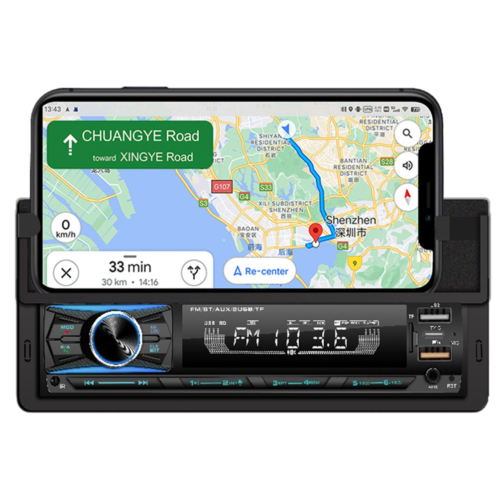 | Holder HP untuk Navigasi Terintegrasi Pakai Google Maps atau Waze kini lebih aman. Holder HP bawaan di bagian atas tape mobil HL86 dapat diatur, mencengkeram smartphone dengan kokoh dan tahan guncangan. Anda tidak perlu lagi memasang phone holder tambahan yang menghalangi dashboard atau kaca depan. |