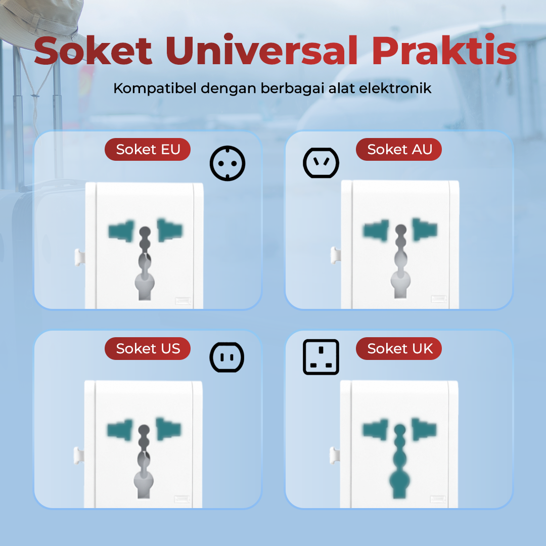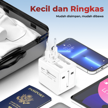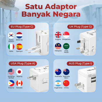 | Adaptor Travel Praktis Adaptor ini memudahkan pengisian daya di berbagai negara tanpa perlu banyak konverter. Plug EU, UK, dan US/AU cukup untuk penuhi kebutuhan daya yang membuat perjalanan lebih praktis dan efisien. |