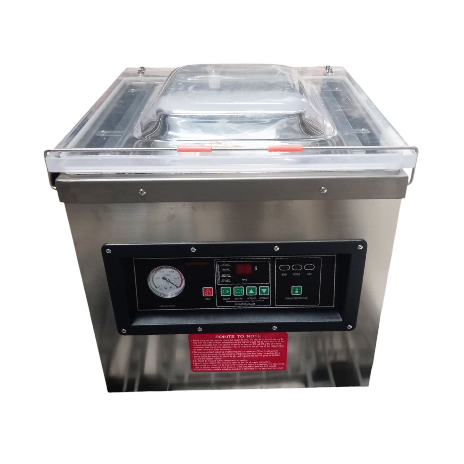 | Tutup Transparan Bagian atas vacuum sealer dilengkapi tutup transparan yang memudahkan Anda memantau proses vakum. Dengan demikian, Anda dapat memastikan penyegelan berjalan optimal dan melakukan penyesuaian jika diperlukan. |
