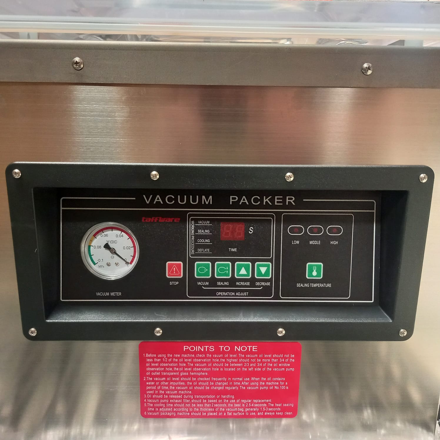 Ingin menyimpan makanan agar lebih awet dan tidak mudah busuk? Sekarang saatnya Anda mencoba vacuum sealer dari Taffware. Dirancang khusus untuk makanan, mesin ini mampu menyedot oksigen di dalam kemasan sekaligus menyegel makanan dengan rapat. Ukurannya ringkas sehingga tidak memakan banyak ruang saat ditempatkan di area kerja. Cocok digunakan di dapur profesional, toko makanan, maupun usaha UMKM. Chamber-nya mendukung penyegelan plastik vakum dengan ukuran hingga 40 cm.
