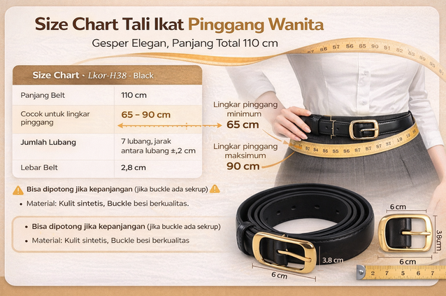 | Bahan Berkualitas Ikat pinggang ini terbuat dari bahan kulit sintetis berkualitas yang menambah kesan elegan dan mewah saat digunakan. Pada bagian kepala buckle terbuat dari bahan besi berkualitas yang kokoh dan awet untuk penggunaan jangka panjang. |