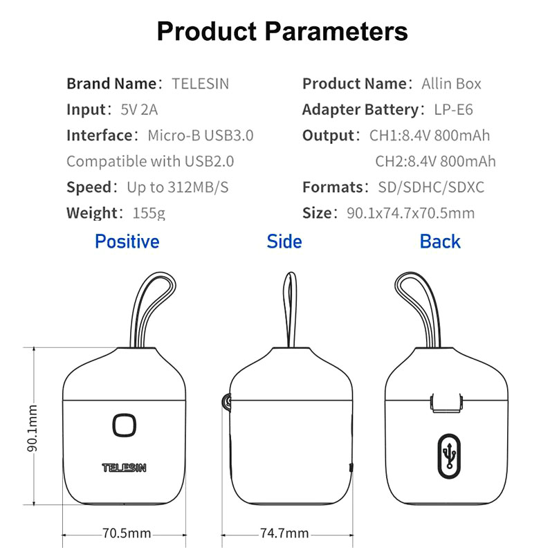 - 1 x TELESIN Allin Box Charger batteries Card Reader Storage box for Canon LP-E6 - AN-BCG-LPE6