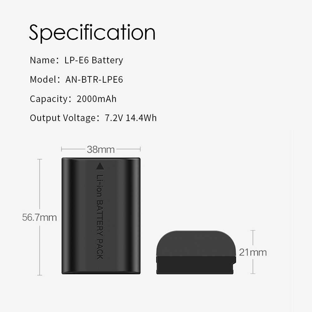 | 2000mAh Baterai untuk Canon LP-E6 & LP-E6n ini memiliki kapasitas 2000mAh yang memastikan kamera anda memiliki daya yang mencukupi untuk merekam segala aksi anda. |