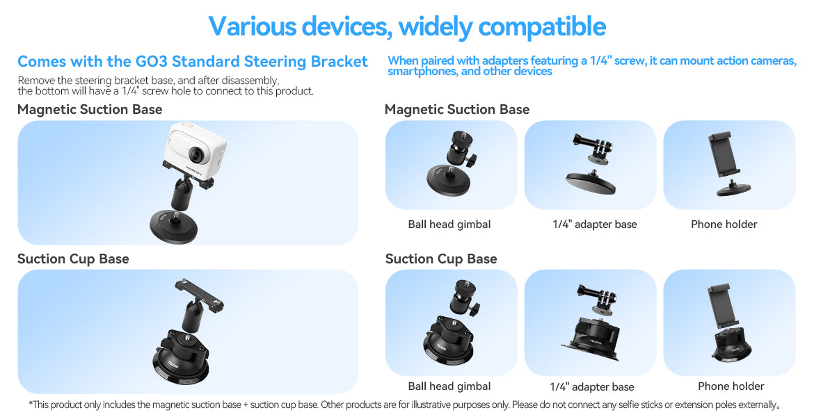 | Berbagai Adapter 1/4 Inch Kedua bracket mount ini dapat mendukung penggunaan steering bracket dari kamera Insta360 GO 3. Karena menggunakan mount 1/4 Inch, Anda juga bisa memasang ball head gimbal, adapter base, bahkan phone holder untuk mengabadikan aktivitas Anda. |