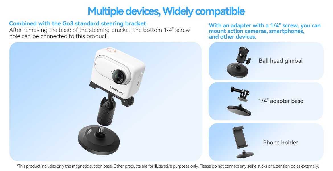 | Berbagai Adapter 1/4 Inch Bracket base magnetic ini dapat mendukung penggunaan steering bracket dari kamera Insta360 GO 3. Karena menggunakan mount 1/4 Inch, Anda juga bisa memasang ball head gimbal, adapter base, bahkan phone holder untuk mengabadikan aktivitas Anda. |