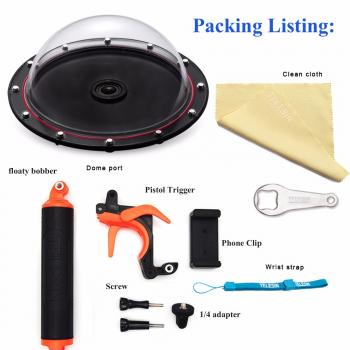 Dome Port ini membuat Anda dapat mengambil efek foto belahan air dan udara secara jelas. Dapat digunakan untuk kamera aksi GoPro Hero 5, GoPro Hero 6 dan dikombinasikan dengan floaty Grip Bobber. Dilengkapi dengan pistol Trigger untuk memudahkan anda mengambil gambar di dalam air hanya dengan menggunakan 1 tangan saja.
