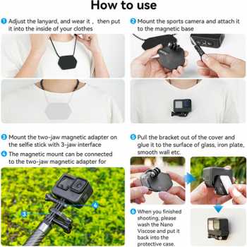 | Penggunaan Sangat Mudah Untuk menggunakan magnetic mount ini sangat mudah. Anda hanya perlu mengalungkan plat magnet di leher Anda. Masukkan ke dalam baju, kemudian tempelkan mount di plat magnet yang sudah Anda kalungkan. Panjang tali atau lanyard bisa diatur sesuai dengan keinginan Anda. Anda bahkan bisa menempelkannya di permukaan yang mengandung magnet seperti kulkas. |