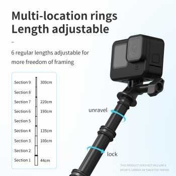 TELESIN tongsis monopod merupakan pilihan yang paling tepat untuk menemani setiap sesi pemotretan Anda menggunakan kamera aksi. Panjangnya adjustable dan memiliki panjang hingga 300 cm. Terbuat dari material yang ringan dan stabil sehingga proses pengambilan gambar akan semakin mudah. Kompatibel untuk kamera aksi GoPro Hero 9, 8, 7, dan 6.