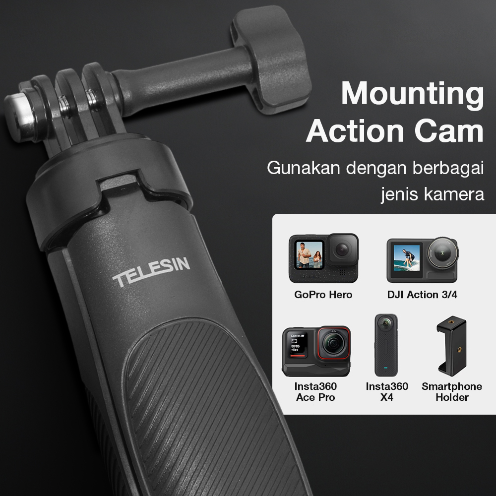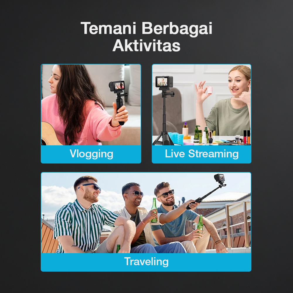 | Gunakan dengan Berbagai Action Cam Mount universal membuat tripod mini kompatibel dengan aneka jenis dan model action cam. Gunakan tripod untuk mengabadikan berbagai momen spesial Anda kapan saja. Anda tidak perlu mengganti aksesori meski menggunakan kamera yang berbeda. |