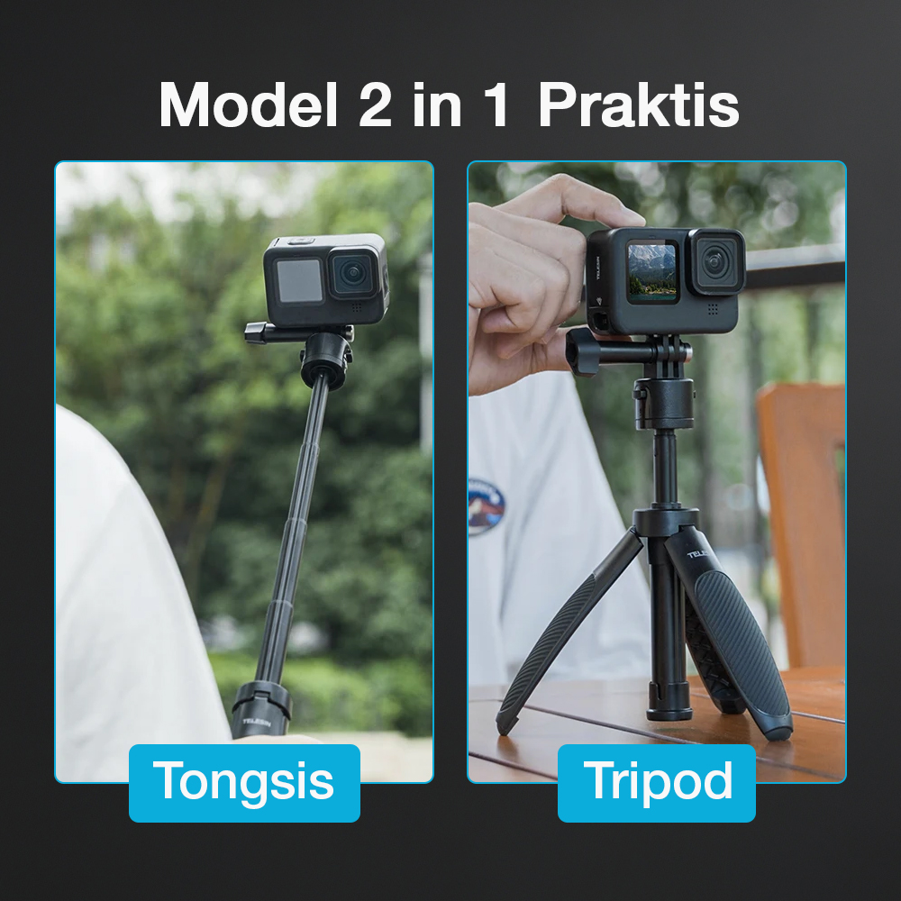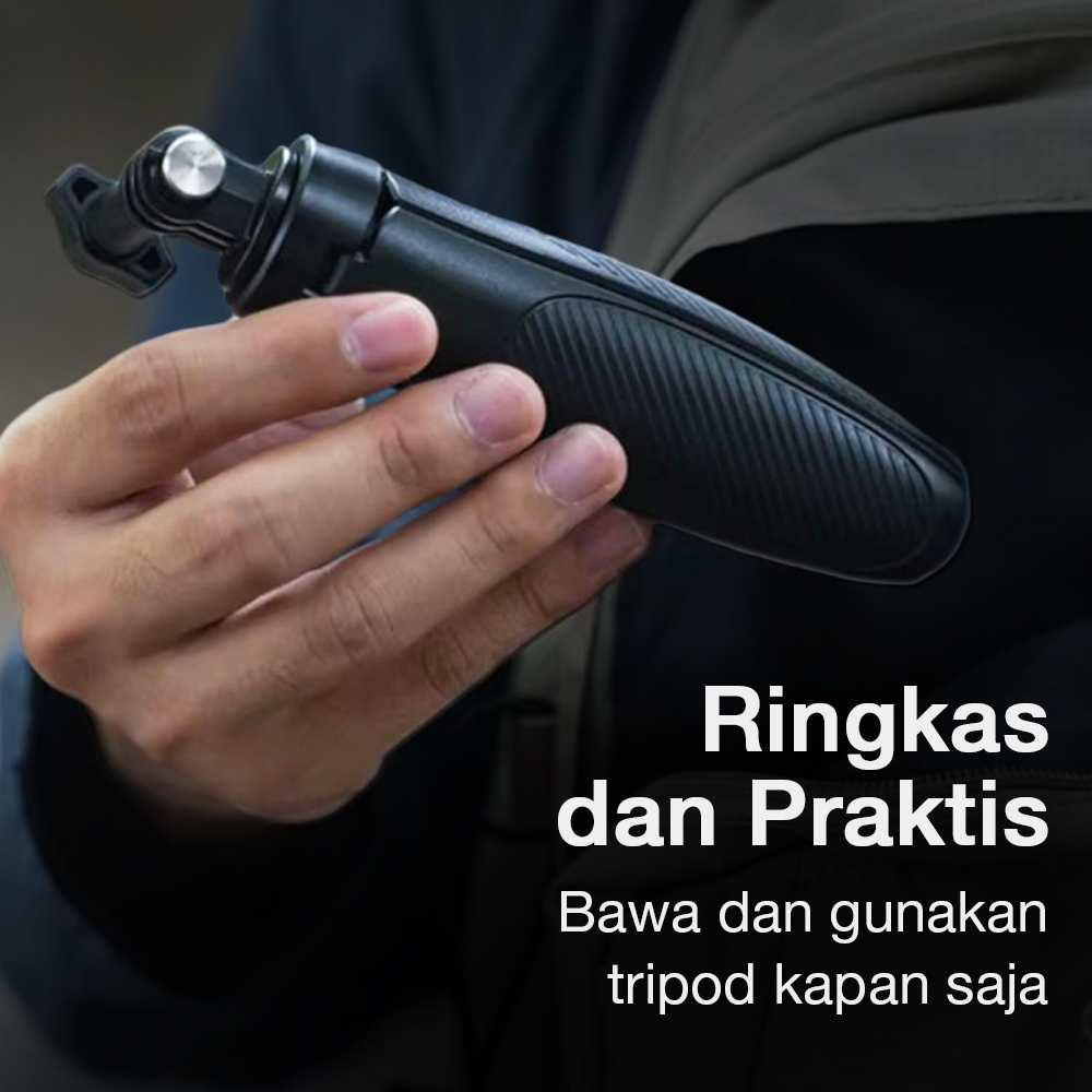 | Model 2 in 1 Praktis Hadir sebagai produk multifungsi, tripod mini ini memiliki model 2 in 1 yang praktis. Gunakan sebagai tripod di atas meja atau bawa menggunakan tangan sebagai tongsis sesuai kebutuhan. Desain ini membuat satu alat dapat digunakan untuk berbagai situasi pemotretan. |