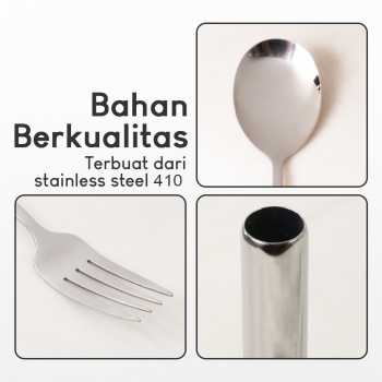 | Bahan Stainless Steel 410 Bahan peralatan makan ini terbuat dari bahan stainless steel 410 yang keras dan tidak mudah tergores, proses pembuatan sudah mengalami test drop untuk memastikan performa kuat dan tidak mudah patah. Memiliki bahan yang kuat dan mudah dibersihkan membuat set peralatan makan ini cocok untuk penggunaan jangka panjang. |
