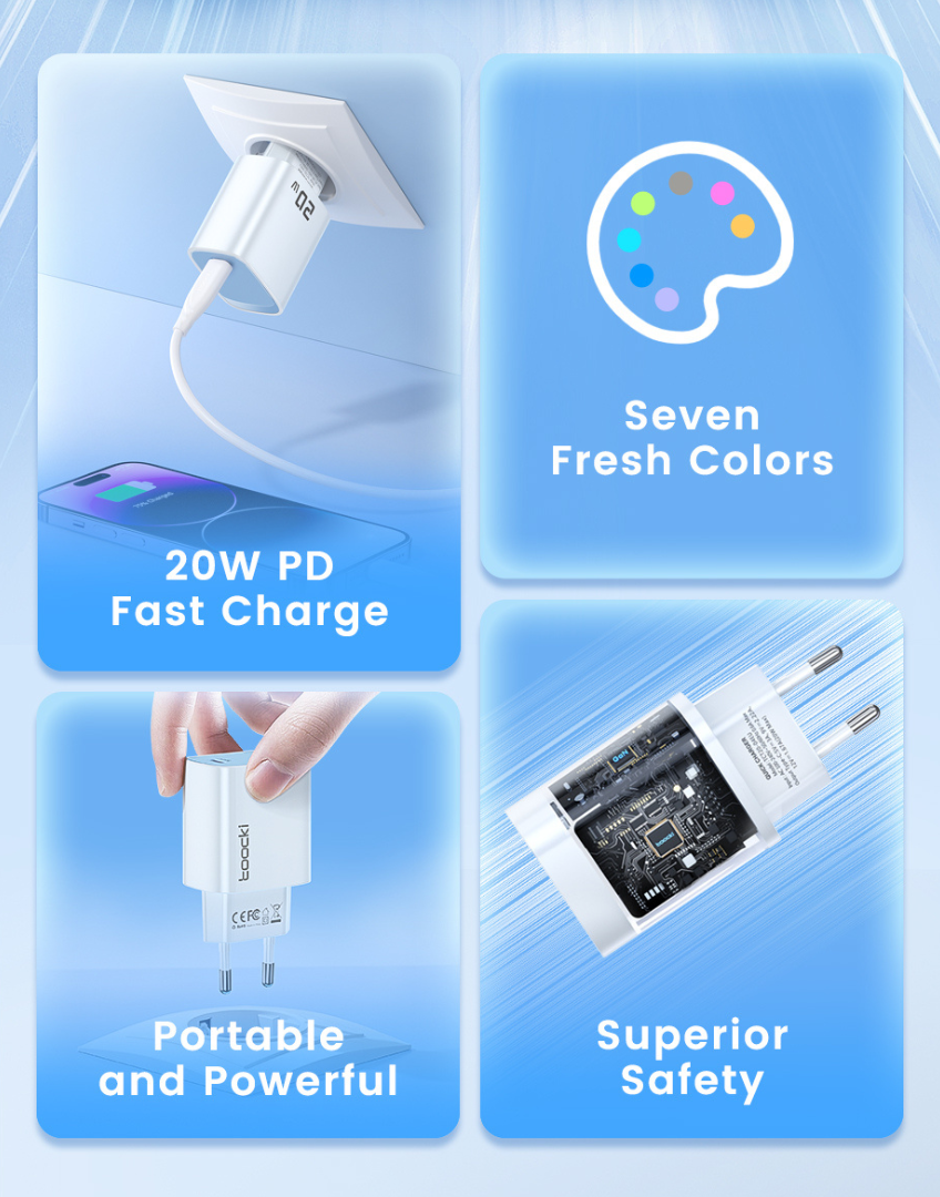 Masih menunggu lama untuk mengisi daya perangkat Anda? Inilah saatnya untuk beralih menggunakan kepala charger USB type C dari Toocki. Dengan port USB type C, charger ini bisa digunakan ke berbagai merek smartphone hingga tablet. Charger ini juga dilengkapi teknologi PD dan chip GaN untuk meningkatkan performa pengisian dayanya. Makin lengkap dengan plug EU yang mempermudah koneksi dayanya di mana pun Anda berada.