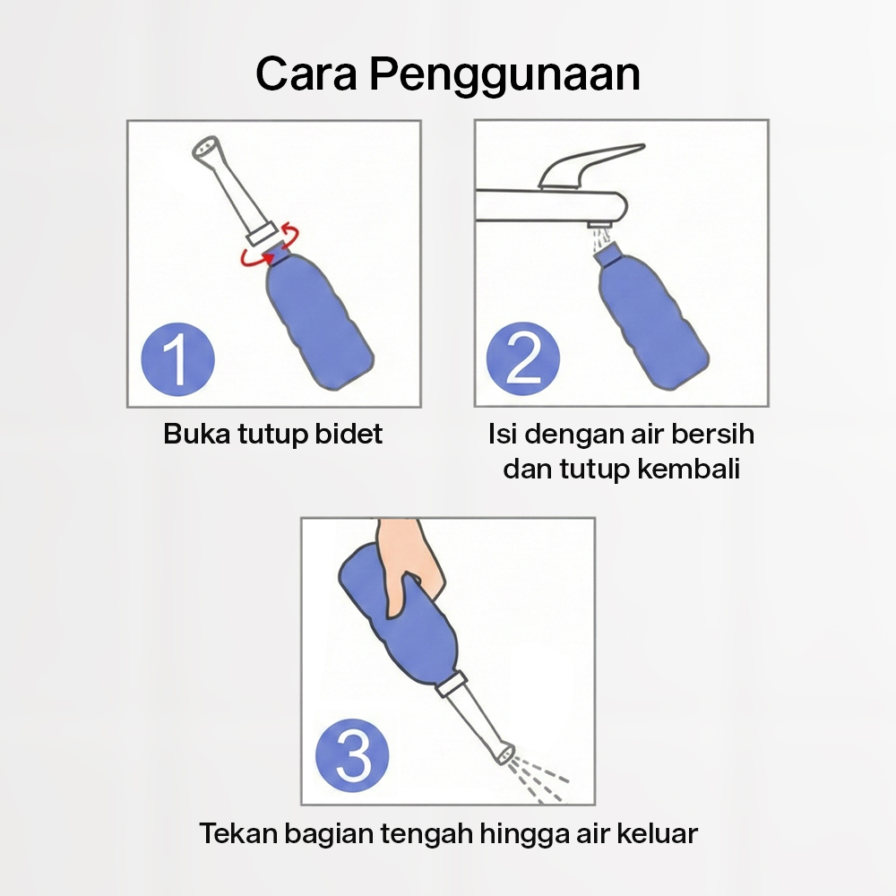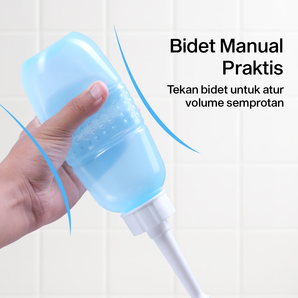 | Bidet Manual Praktis Menggunakan mekanisme manual, bidet portable ini menggunakan model tekan yang memudahkan Anda untuk mengatur semprotan air. Cukup menekan bagian tengah botol untuk mengeluarkan air. |