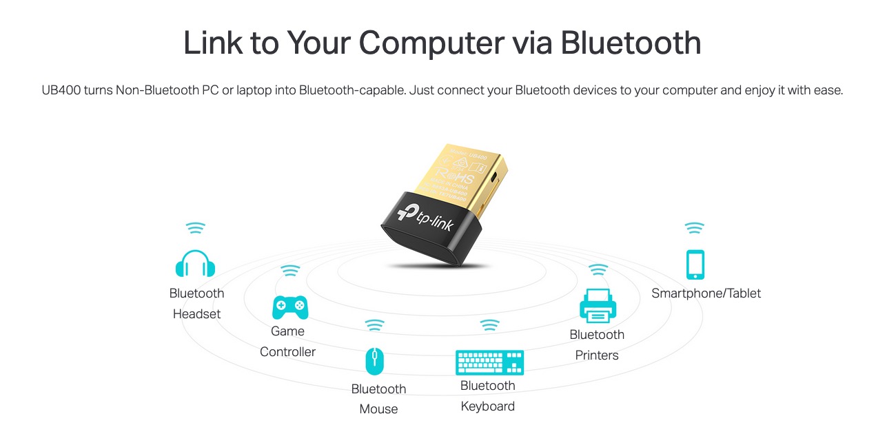 | Hadirkan Konektivitas Bluetooth pada PC UB400 mengubah PC atau laptop non-bluetooth menjadi memiliki kemampuan bluetooth. Cukup sambungkan perangkat bluetooth ini ke komputer, maka komputer Anda dapat terhubung ke berbagai perangkat bluetooth seperti speaker, headset, dan lain-lain.