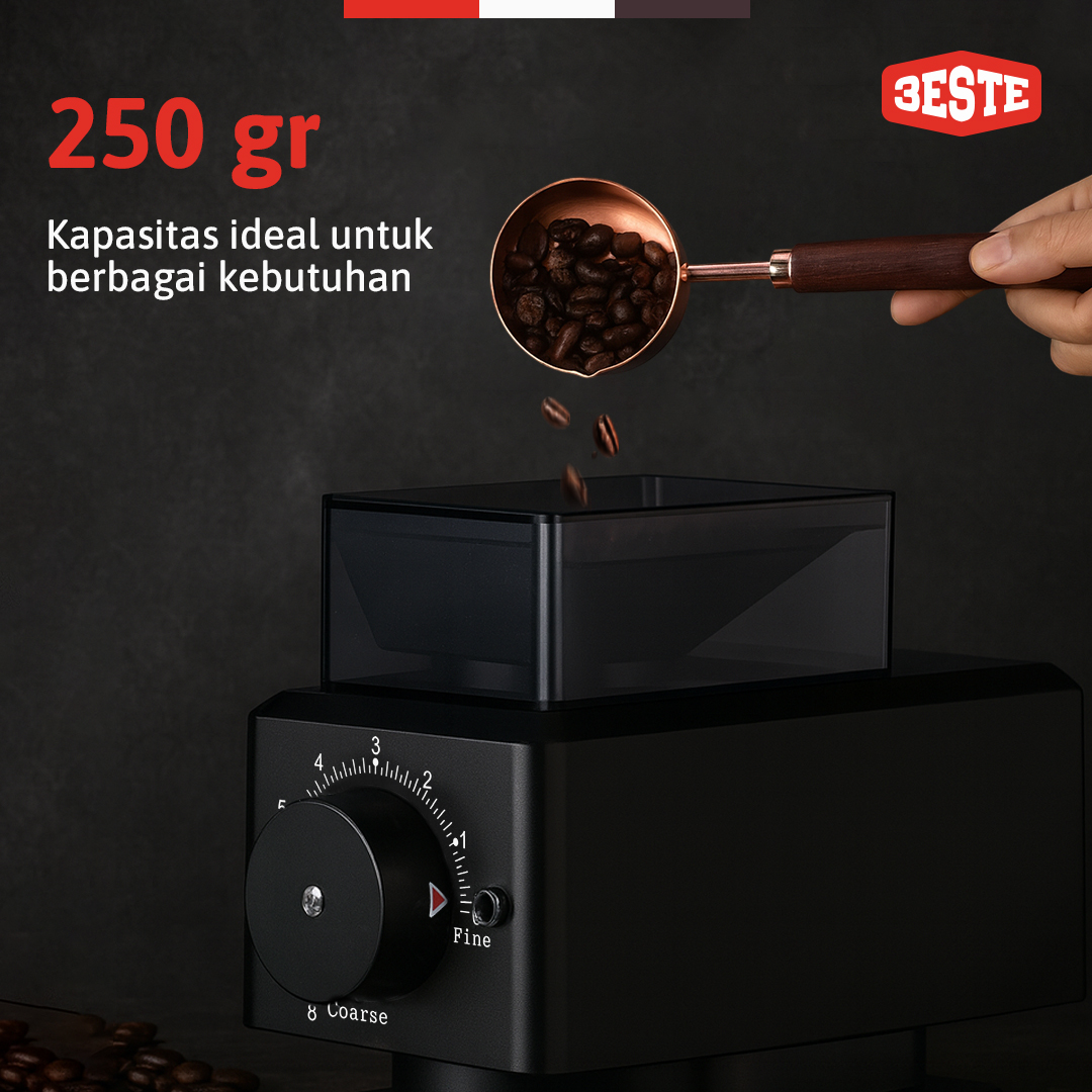 Buat proses menggiling biji kopi jadi lebih praktis dan cepat dengan penggiling kopi elektrik dari Trieste. Burr penggiling dari stainless steel kuat dan presisi untuk hasil gilingan yang halus. Anda juga dapat memilih tingkat kehalusan gilingan sesuai selera. Semakin praktis dengan adanya wadah untuk menyimpan biji kopi pada bagian atas. Nikmati setiap tetes kopi dengan cita rasa yang sempurna.
