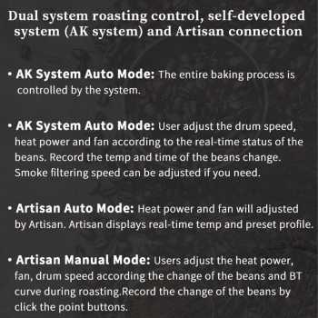 | Kontrol Sangrai Manual dan Auto Alat sangrai biji kopi bisa menggunakan AK System Auto Mode, seluruh proses sangrai dikendalikan sepenuhnya oleh sistem di mana alat secara otomatis mengatur daya, suhu, aliran udara dan lainnya. Anda juga bisa menggunakan mode manual sehingga memungkinkan penyesuaian daya panas, kecepatan drum, serta kipas secara real-time berdasarkan kondisi biji kopi. |