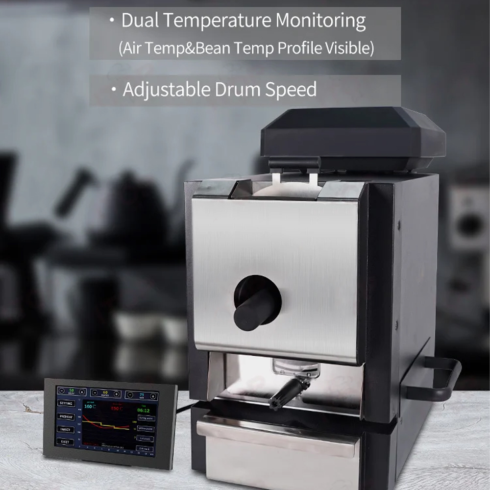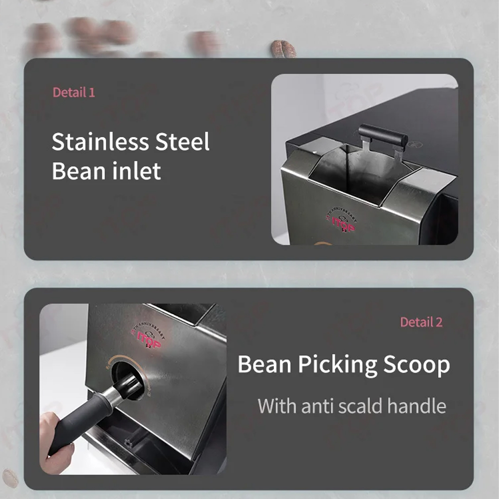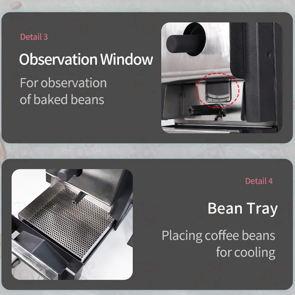 | Fungsional dan Material Tahan Lama Dilengkapi stainless steel bean inlet, bean picking scoop dengan handle anti panas, observation window untuk memantau perubahan warna biji secara visual, serta controller intuitif dengan tampilan data lengkap. Seluruh bodi dan komponen dirancang kokoh, stabil, dan mudah dirawat untuk penggunaan jangka panjang. |