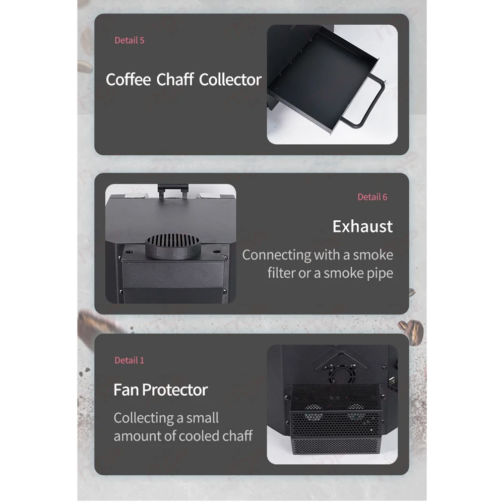 | Pembuangan Asap Ramah Lingkungan Saluran exhaust dirancang untuk dapat dihubungkan dengan smoke filter atau pipa pembuangan, membantu mengurangi asap dan bau sangrai. Fitur ini membuat mesin lebih ramah lingkungan dan nyaman digunakan di dalam ruangan, termasuk kafe, lab kopi, atau dapur sangrai kecil. |
