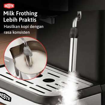 | Milk Frothing Lebih Praktis Membuat berbagai kreasi kopi lebih mudah berkat adanya sistem frothing canggih. Steam wand menggunakan uap bertekanan tinggi untuk membuat buih susu lembut serta menuangkannya langsung pada minuman untuk hasilkan latte art. |