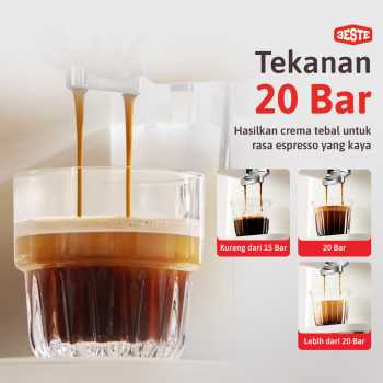 | Tekanan 20 Bar yang Pas Mesin dengan tekanan 20 bar menghasilkan espresso dengan crema terbaik. Crema atau busa pada lapisan atas kopi ini tebal untuk hasil espresso dengan rasa dan aroma yang kaya. |