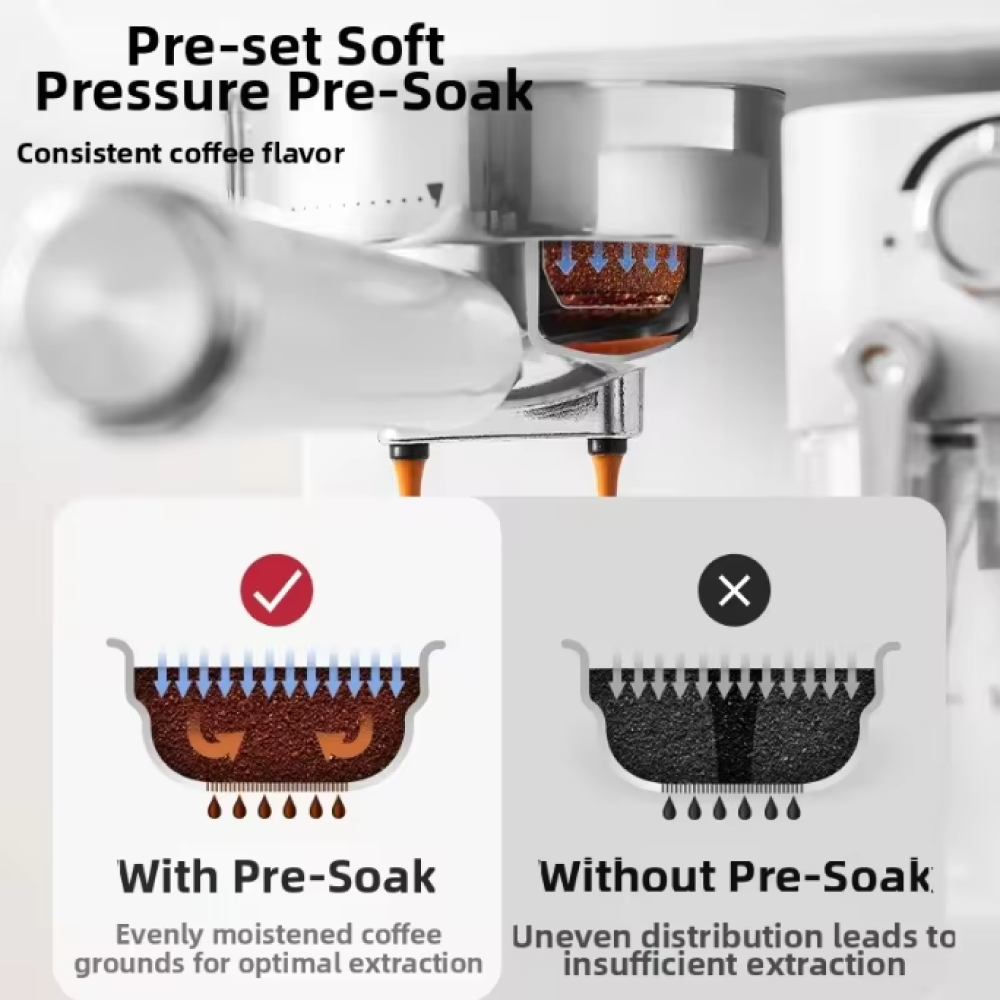 | Tekanan 20 Bar yang Pas Mesin dengan tekanan 20 bar menghasilkan espresso dengan crema terbaik. Crema atau busa pada lapisan atas kopi ini tebal untuk hasil espresso dengan rasa dan aroma yang kaya. |