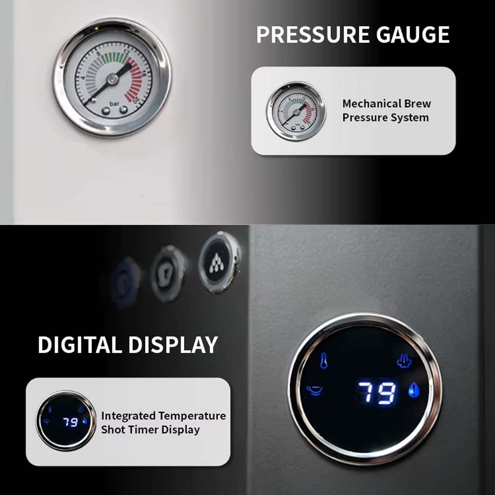 | Pressure Gauge & Digital Display Pressure gauge analog membantu memantau tekanan saat brewing secara real-time. Digital display menampilkan suhu serta shot timer untuk kontrol ekstraksi yang lebih akurat. Kombinasi ini sangat membantu baik pemula maupun barista berpengalaman. |